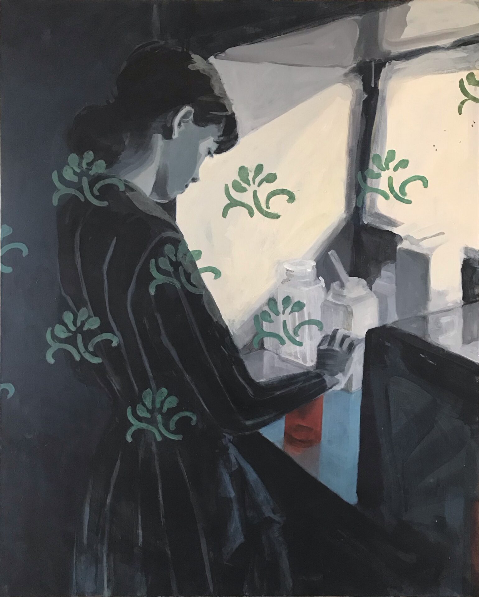 小木曽が主に描くのは自身の家族やその周辺の風景です。落ち着いた色彩を組み合わせて描かれる絵画空間からは対象の存在感が浮かび上がってきます。