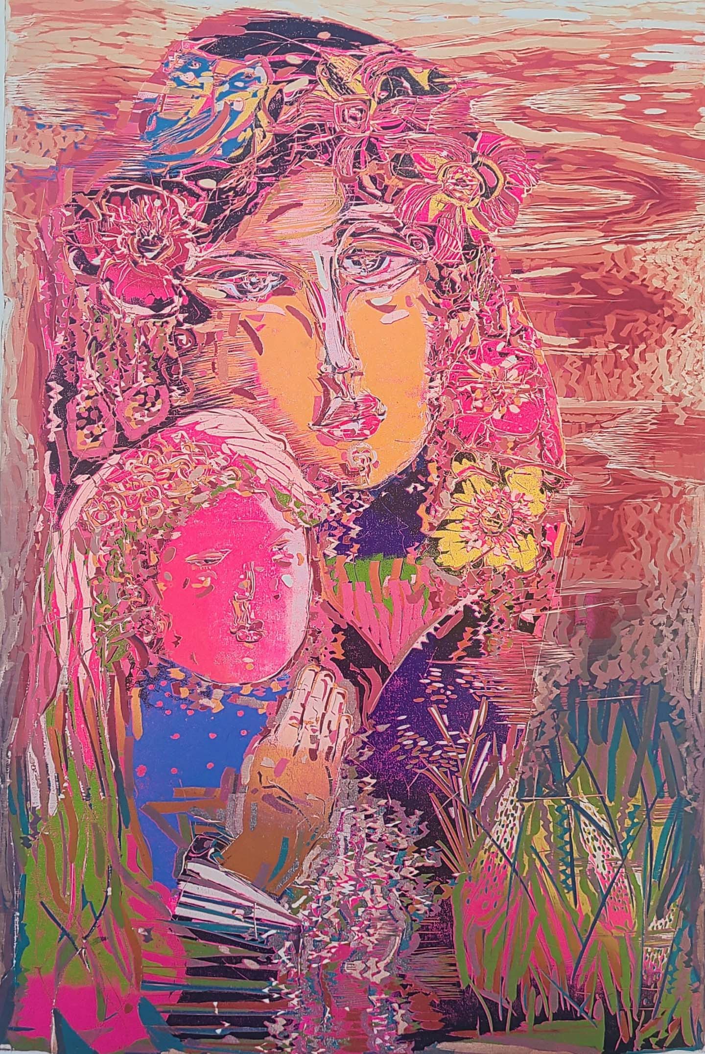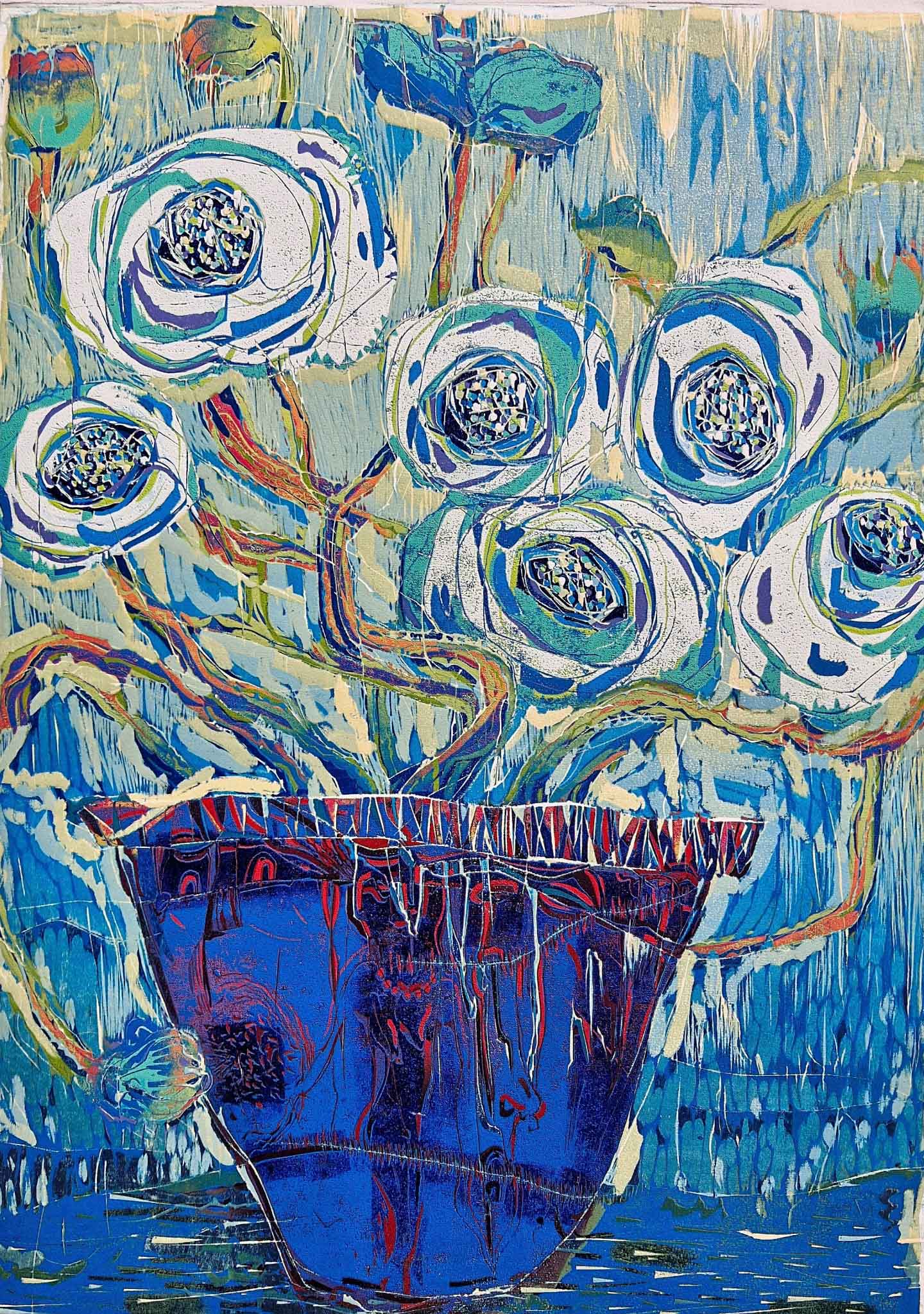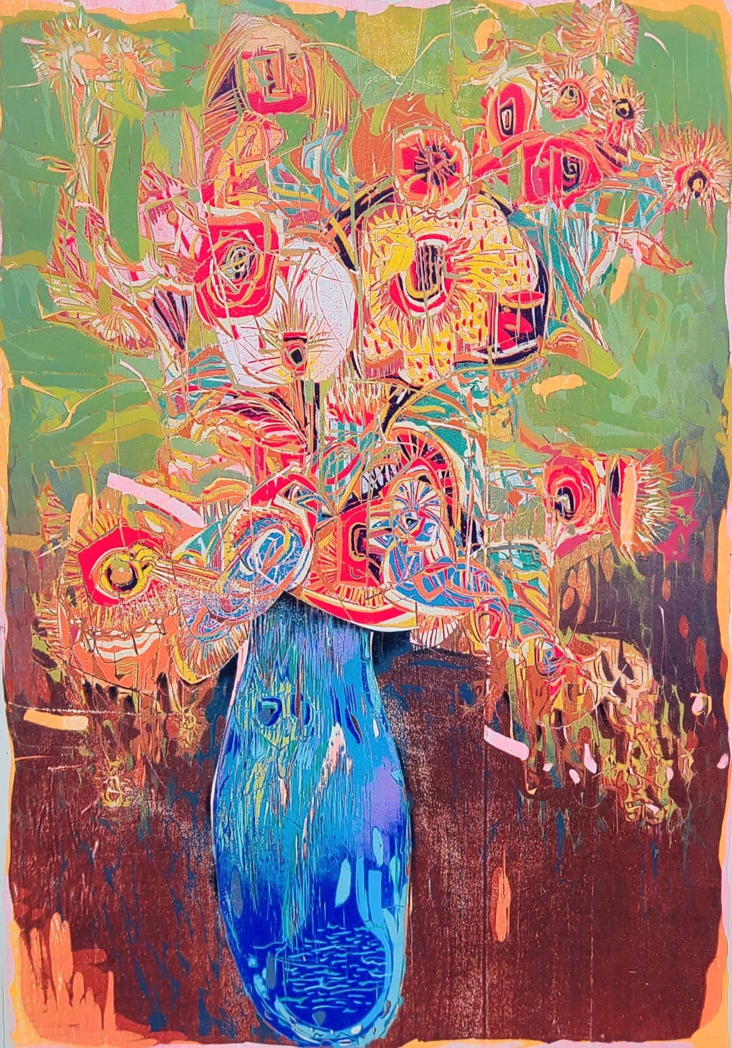 韓国と日本の美術大学で版画を学んだ李。「彫り進み木版画」技法(1枚の版を使った多色刷り技法。1色刷り終えるごとに版を彫り、次の色を刷る)で制作します。後戻りのできない技法で勢いよく生み出されるラインと鮮やかな色彩は、エネルギーと自信に溢れています。
